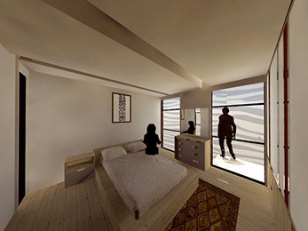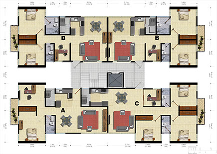 These are medium-sized apartments, feature two bedrooms and are the highest in number. These apartments are 2 per floor (except for the 5th floor that houses the Penthouse), feature a main room with bathroom and dressing room, one additional bedroom with closet, living room, dinning room with kitchenette, laundry room, full bathroom, bedroom or study, terrace or balcony.