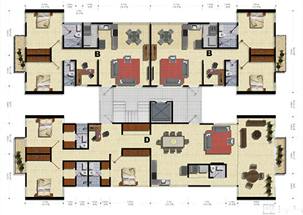 These are medium-sized apartments, feature two bedrooms and are the highest in number. These apartments are 2 per floor (except for the 5th floor that houses the Penthouse), feature a main room with bathroom and dressing room, one additional bedroom with closet, living room, dinning room with kitchenette, laundry room, full bathroom, bedroom or study, terrace or balcony.