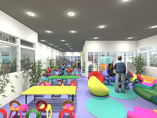 Day Care, a space designed for the infants and elderly attention with a monitor at the entrance of the people assigned to that area.