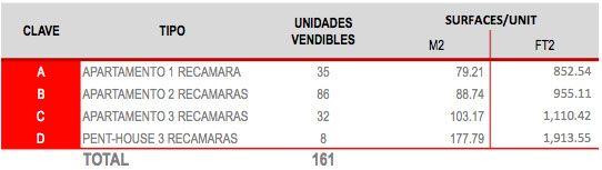 • Un total de 1,965.46 m2 (21,156.01 ft2) de construcción por edificio y 15 apartamentos por edificio, distribuidos en 5 niveles como sigue: