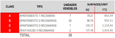 • Un total de 1,965.46 m2 (21,156.01 ft2) de construcción por edificio y 18 apartamentos por edificio, distribuidos en 5 niveles como sigue: