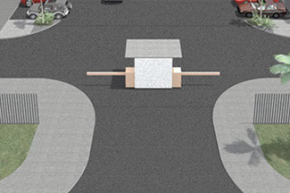En las puertas de acceso al conjunto habitacional, tendremos dos garitas con caseta para policías las 24 horas 7 días de la semana, una reja automática para los habitantes y una pluma operada manualmente para los visitantes registrados, además puertas peatonales y jardines además del indicador del nombre del conjunto.