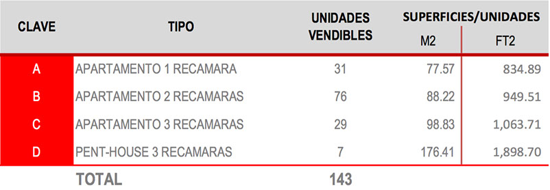 •Un total de 2,762.40 m2 (29,734.20 ft2) de construcción con 23 apartamentos por edificio, distribuidos en 6 niveles como sigue: